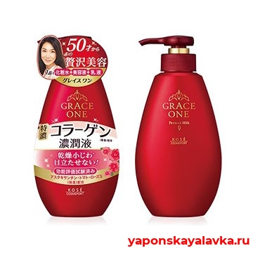 Серия уходовой косметики под брендом Grace One выпускается концерном Kose с 2013 года специально для женщин 45–50 лет. В 2015 году состав линейки обновился и теперь Grace One содержит хорошую концентрацию самого мощного из всех известных на сегодняшний день антиоксидантов - астаксантина. Молочко разглаживает кожу и препятствует появлению новых мелких морщин вокруг глаз и губ. Глубоко увлажняет кожу лица и делает её более упругой. Способствует выравниванию тона кожи. Подходит для всех типов кожи. У молочка легкий персиковый оттенок натурального происхождения за счет астаксантина, аромат тоже натуральный - экстракт розы Центифлория. Идеально сочетается с лосьоном Grace One White Lotion, вместе они образуют минимальный достаточный ежедневный уход за кожей.