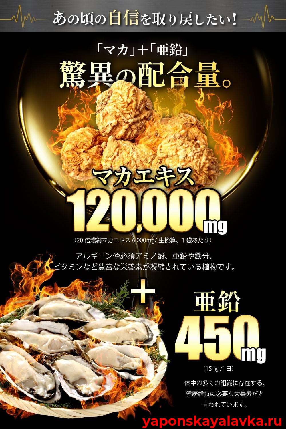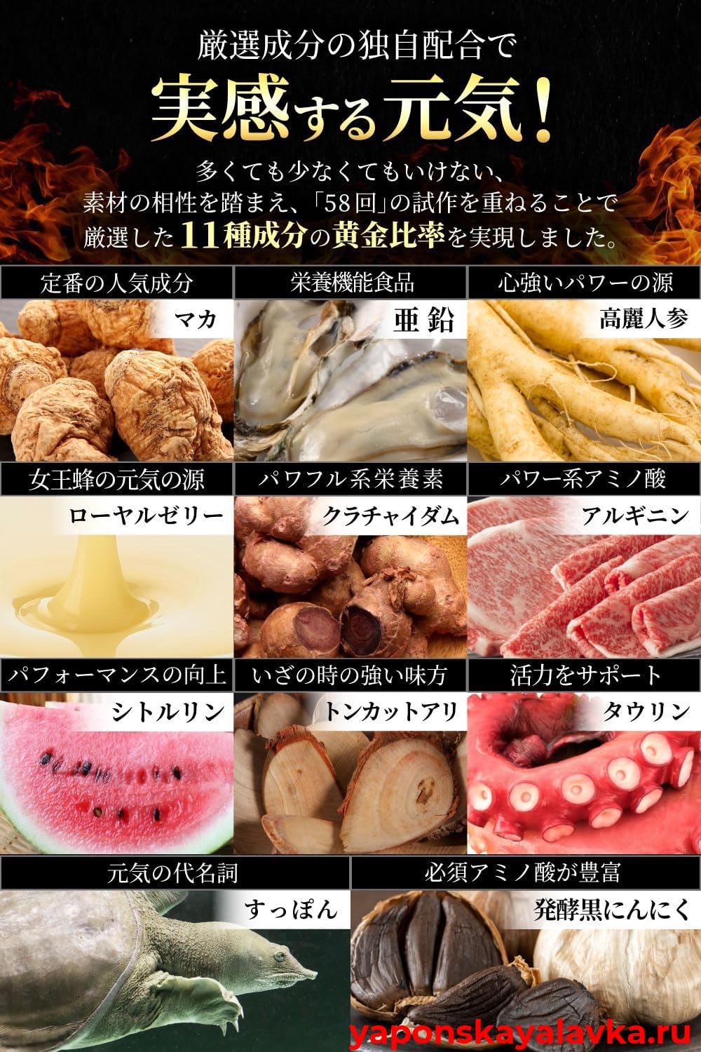 11 тщательно подобранных ингредиентов: помимо маки и цинка, этот комплекс содержит роскошную комбинацию цитруллина, аргинина, маточного молочка, таурина, тонгката али, женьшеня, экстракта мягкопанцирной черепахи, экстракта чёрного имбиря и ферментированного чёрного чеснока.