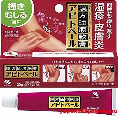KOBAYASHI Apitoveil Мазь - натуральная мазь по рецепту традиционной китайской медицины из фито-ингредиентов, таких как пчелиный воск, кунжутное масло и рыбий жир лосося. Предназначается при кожных заболеваний, таких как дерматит, экзема, потница, ожоги, обморожения, трещины на кожи сопровождающееся зудом, появлению пузырьков, гнойничков, чешуек. Мазь оказывает мощное противовоспалительное действие, успокаивает, подсушивает, заживляет ранки, убирает зуд и боль на пораженном участке кожи.