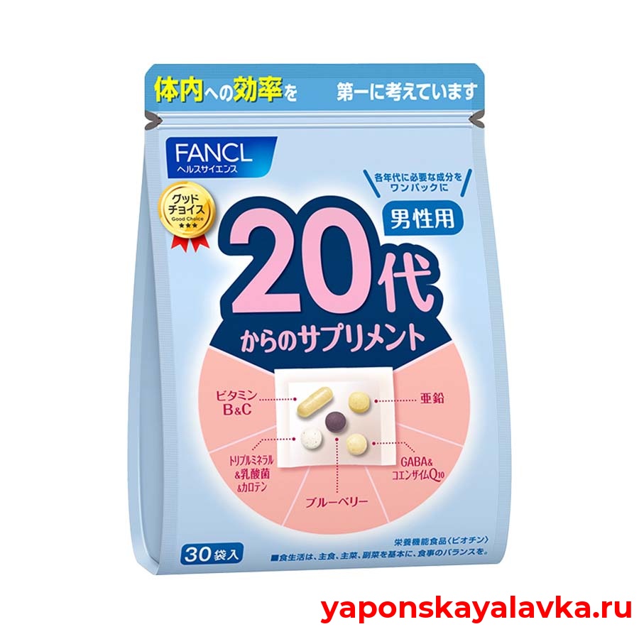 Этот комплекс витаминов, минералов и полезных веществ создан компанией Fancl специально для молодых мужчин от 20 до 30 лет. В этом возрасте мужчины ведут активную жизнь и занимаются спортом. Однако, повседневный стресс, нерегулярное и неполноценное питание, курение и приём алкоголя могут ослабить организм и лишить его сил. С помощью этой добавки Вы сможете поддержать жизненную активность и восполнить недостающие организму питательные вещества и витамины с минералами. В состав комплекса входит растительный ингредиент Tsuintosu, который получен из полисахаридов корня цикория. Это вещество способствует лучшей усвояемости магния и кальция. Активный компонент, содержащийся в экстракте чеснока, аллицин, а также его производные оказывают антиоксидантный эффект, способствуют повышению иммунитета. Также чеснок имеет сосудорасширяющее и детоксицирующее действие. Докозогексаеновая полиненасыщенная жирная кислота благоприятно воздействует на функцию головного мозга и зрение. Содержащийся в составе добавки куркумин помогает ослабить вредное воздействие алкоголя. Таким образом, приём комплекса Fancl для молодых мужчин 20 – 30 лет поможет всегда поддержать силы, необходимые для насыщенной полноценной жизни